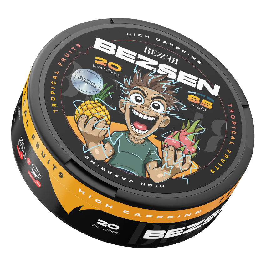 BEZSEN - Tropical Fruits to woreczki kofeinowe, które smakują jak egzotyczna ucieczka na tropikalną wyspę. Ananas, dragon fruit i marakuja mieszają się w soczystym miksie, który od pierwszej chwili daje słodycz i orzeźwienie. To smak słońca, plaży i wakacyjnej lekkości – a w tle czeka solidny kop kofeiny, który zamienia marzenia o odpoczynku w realny zastrzyk energii.